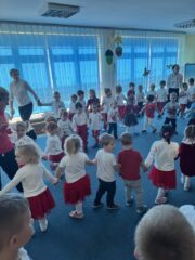 7 listopada w naszym przedszkolu obchodziliśmy Narodowe Święto Niepodległości. Dzieci uczestniczyły w spotkaniu, podczas którego rozmawialiśmy o symbolach narodowych i znaczeniu tego wyjątkowego dnia dla wszystkich Polaków. O godzinie 11:11 cała społeczność przedszkola włączyła się w ogólnopolską akcję „Szkoła do hymnu”, wspólnie i z wielkim zaangażowaniem odśpiewując „Mazurka Dąbrowskiego”